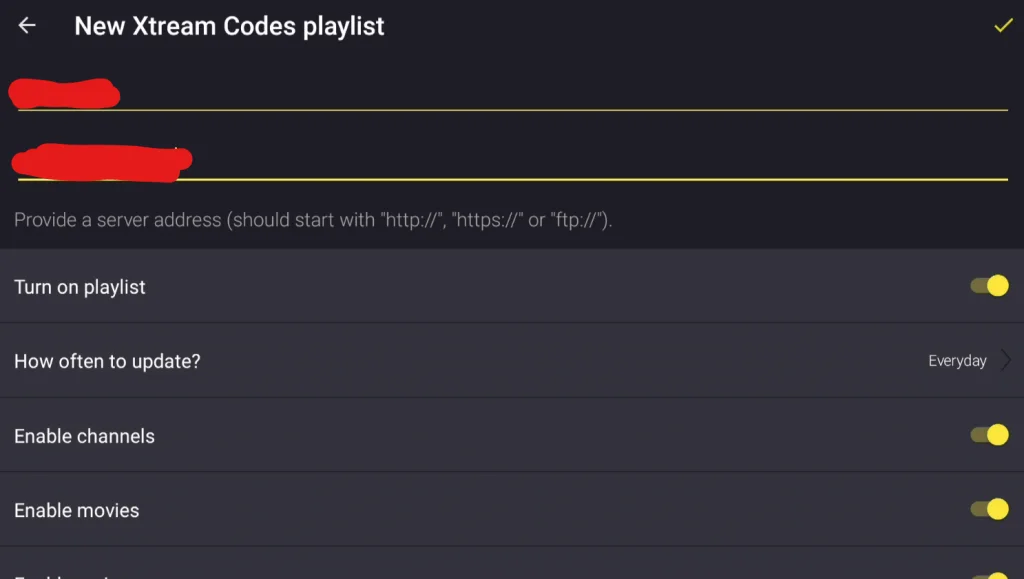 För bästa upplevelse rekommenderas att använda Xtream Codes-inloggning med dina uppgifter från IPTV King. Då installeras programguiden (EPG) automatiskt i bakgrunden.