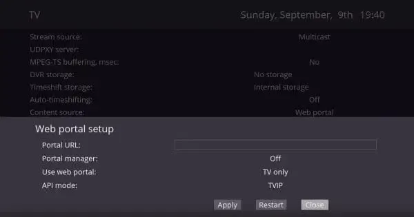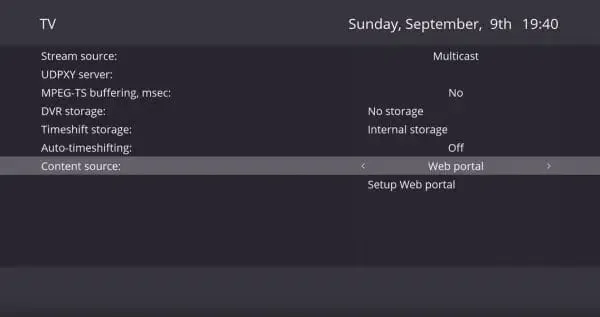 Ange de uppgifter som du fått från IPTV King i portalinställningarna. När du sparar inställningarna kommer kanaler och programguide att laddas in automatiskt.